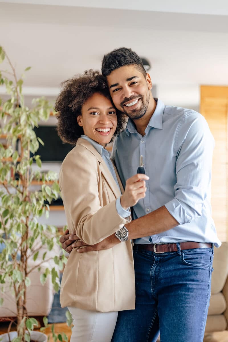 Happy couple celebrating homeownership, holding house keys, in a cozy living room setting, representing Kash Mortgage Group's mortgage services for homeowners.